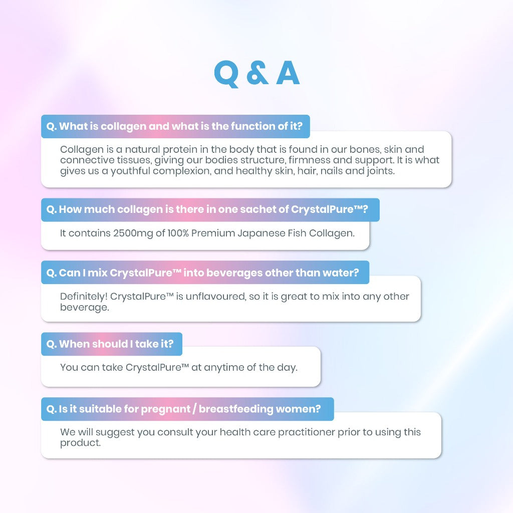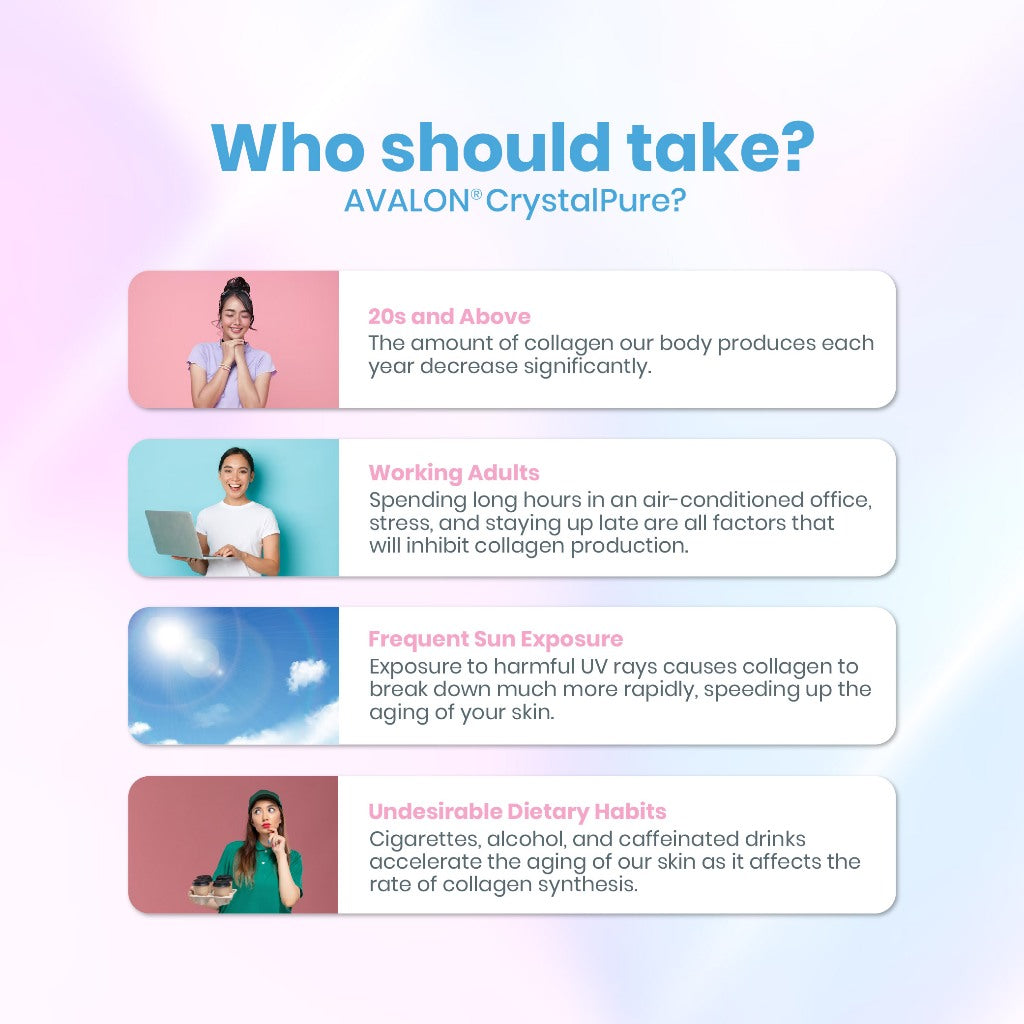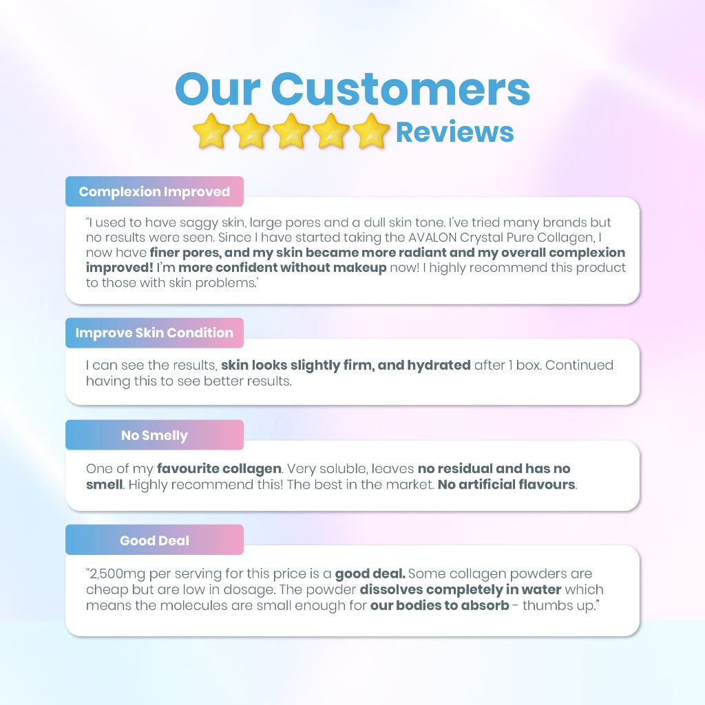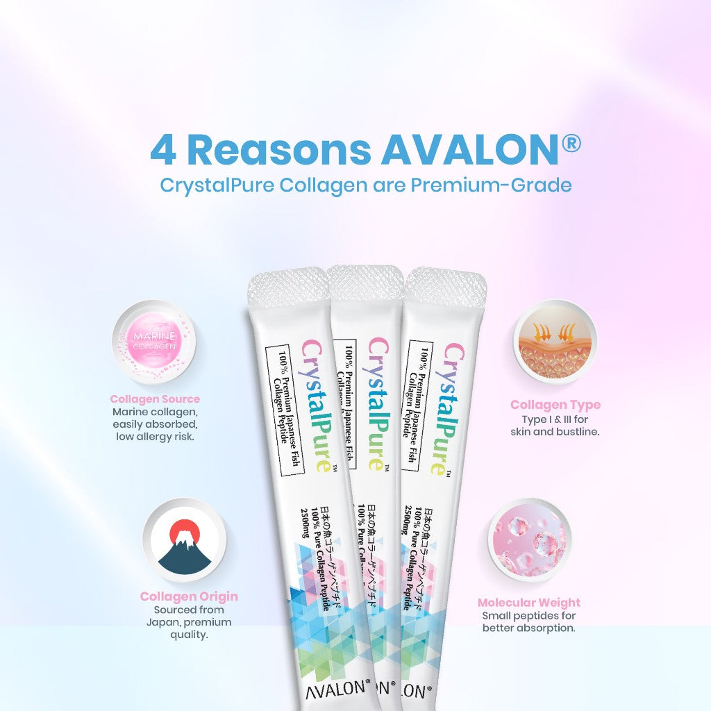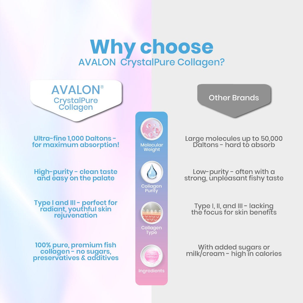 Normal collagen has a molecular weight of ~300,000 Daltons, which makes it difficult for our bodies to absorb, while collagen peptides typically have a molecular weight of 2,000 - 5,000 Daltons. The collagen peptides in AVALON® CrystalPure have a molecular weight lower than 1,000 Daltons, which allows them to be fully utilized by our bodies.