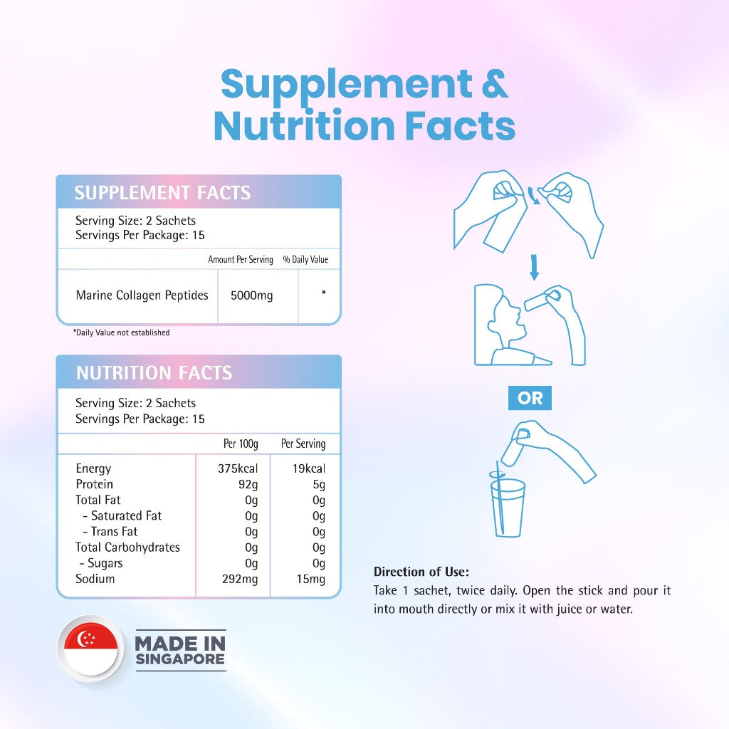 An exclusive Collagen formula that consists of 100% Japanese Fish Collagen Peptides for the best skin rejuvenating results. Achieve healthy skin, hair, nails, breasts & joints with our type I and III collagen peptides - as small as 1,000 Daltons for easy absorption! Besides, our high-quality collagen that is produced in Japan has no fishy taste nor additives added.