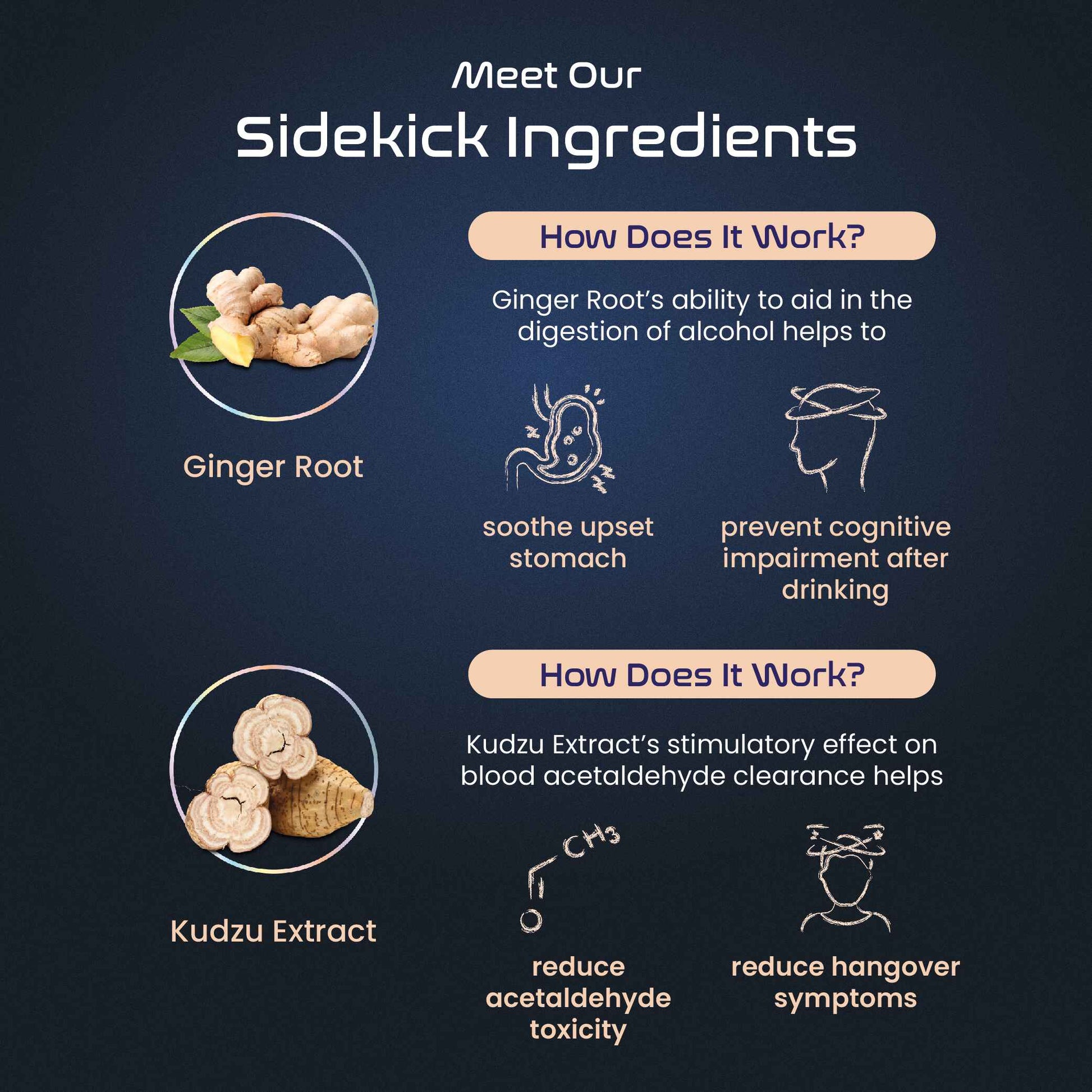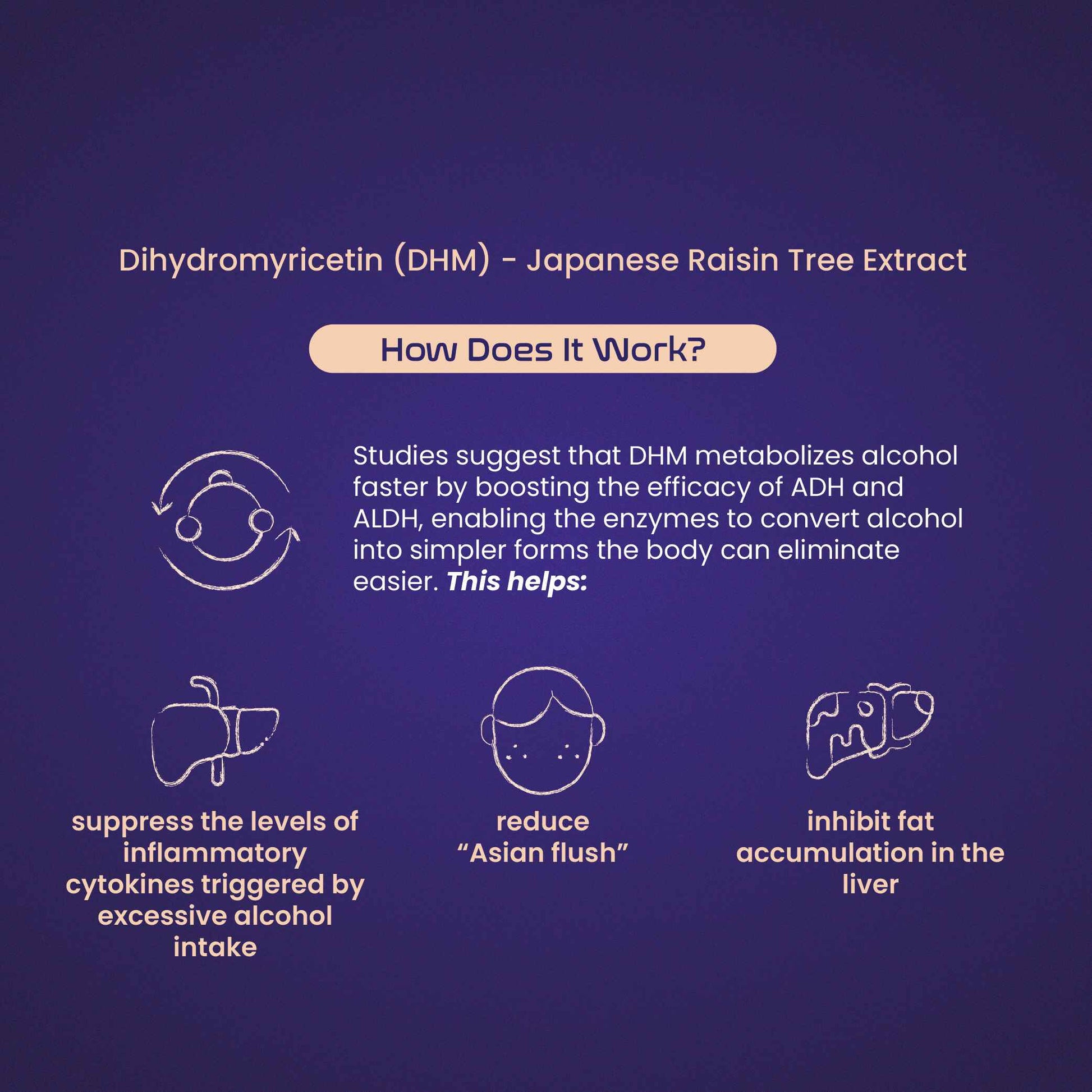 DHM triggers the liver to produce more alcohol-gobbling enzymes: alcohol dehydrogenase (ADH) & acetaldehyde dehydrogenase (ALDH). Studies suggest that DHM metabolizes alcohol faster by boosting the efficacy of ADH and ALDH, enabling the enzymes to convert alcohol into simpler forms the body can eliminate easier.