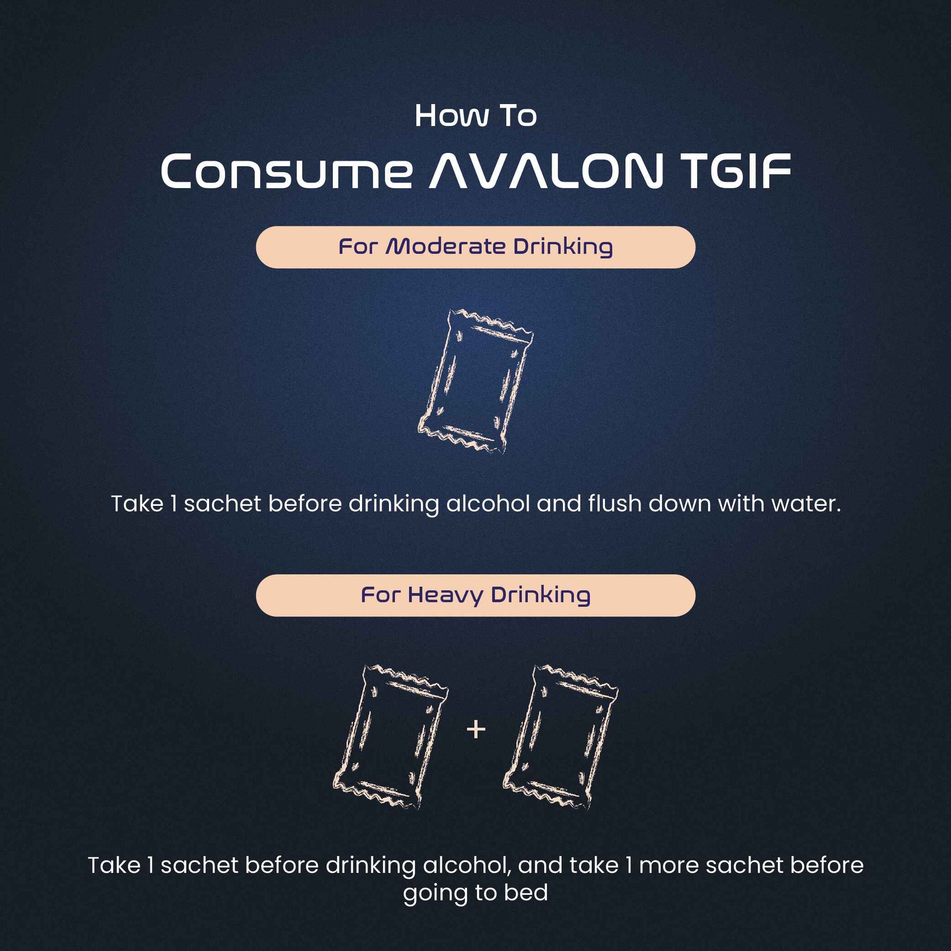 Take 1 sachet before drinking alcohol, and take 1 more sachet before going to bed