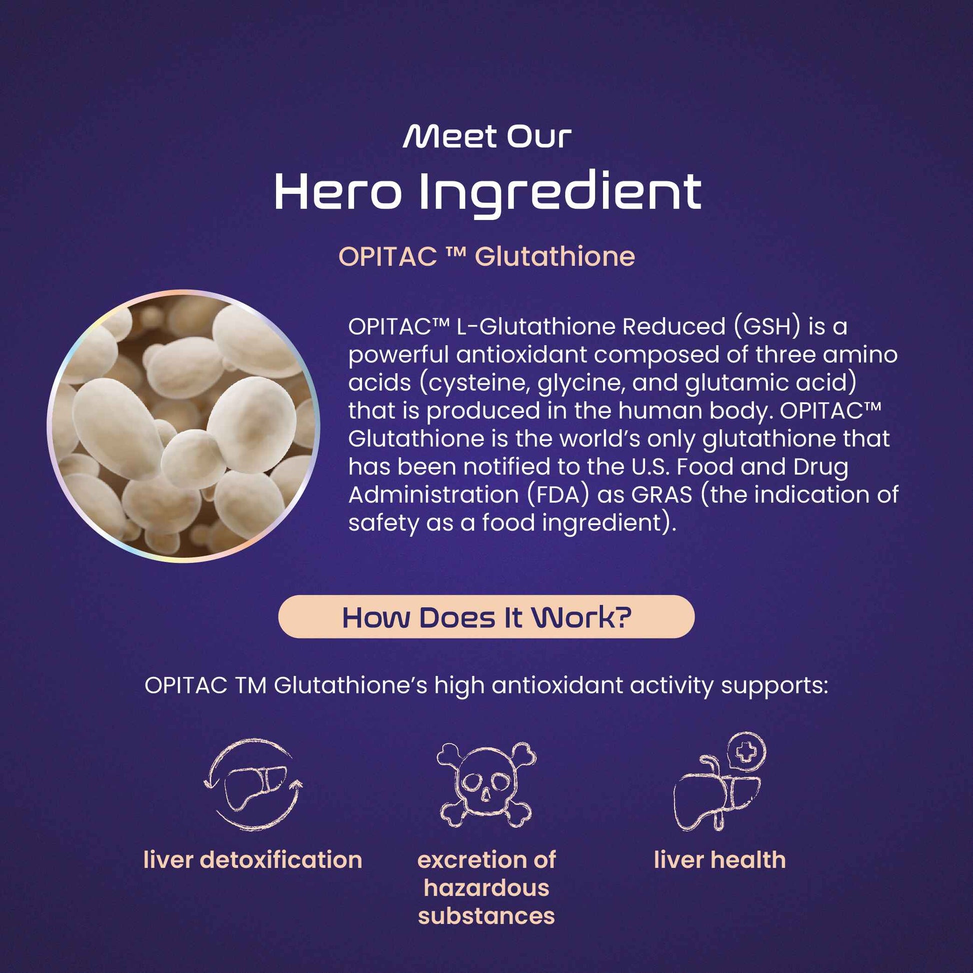 OPITAC™ L-Glutathione Reduced (GSH) is a powerful antioxidant composed of three amino acids (cysteine, glycine, and glutamic acid) that is produced in the human body. OPITAC™ Glutathione is the world’s only glutathione that has been notified to the U.S. Food and Drug Administration (FDA) as GRAS (the indication of safety as a food ingredient).